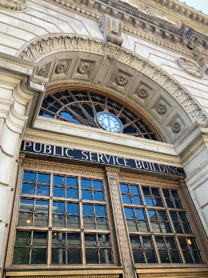 In Milwaukee, an informal walking tour was the ideal way to notice the shifts taking place between old and new, to get a feel for the history of rail transportation here, and to admire some of the city’s unique buildings. The Public Service Building, for example, is beautiful to look at from the street. A large and imposing structure, it dates back to 1905 and is an example of Beaux-Arts neoclassical architecture. The unique ornamentation on its façade points to the transitions between different forms of transportation, from horse-drawn carriage to electric streetcar. Taking up a whole city block, the building originally served as the central terminal for the interurban rail system and the headquarters for the Milwaukee Electric Railway and Light Company. Its size and scale combined with the attention given to its architectural design and detail point to the past importance of public rail transportation, before automobiles became a commonplace feature of American life. Although the building was closed that Saturday, we were able to peer in at its famous marble lobby and staircase through the windows.