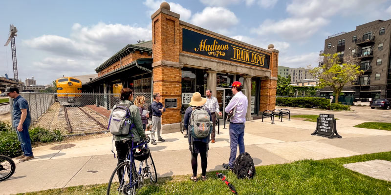 The place-based workshop is an annual event, held since 2007, that takes graduate students and faculty associates out of the classroom and into the field to explore the complex relationships between culture and nature. The started their three-day tour of Wisconsin’s rail tracks and bike trails on West Washington Avenue because the space, now occupied by shops and upscale restaurants, used to be the old Milwaukee Road Depot — Madison’s main hub for train activity from 1903–71. At the historic intersection, Scott Lothes and Heather Sonntag from the Center for Railroad Photography and Art started the workshop with an in-depth look at the history of not only the space, but the Milwaukee Road line, which in its heyday, spanned 11,252 miles across the Midwest and West.