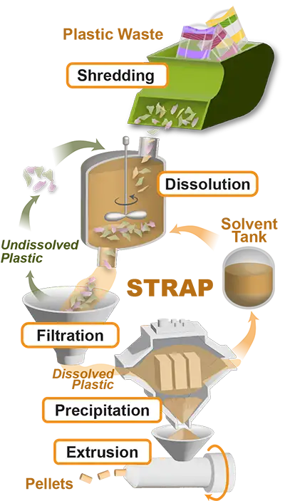 STRAP makes it possible to recycle plastics that were previously unrecyclable, including multilayer packaging, flexible films, and rigid packaging material. It works by selectively dissolving and purifying individual polymers from mixed plastic waste, producing high-quality recycled plastics without degrading their properties.