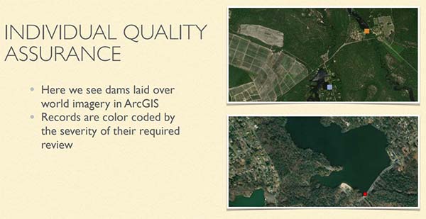The unique challenge for The Nature Conservancy project in assessing the status of these freshwater networks is the creation of a database of dam locations from disparate sources and expert knowledge. Wilz created an automation process to assess dam records, verify the location, and highlight necessary corrections. By using this tool, small teams can verify the locations of thousands of dams in just a few minutes.